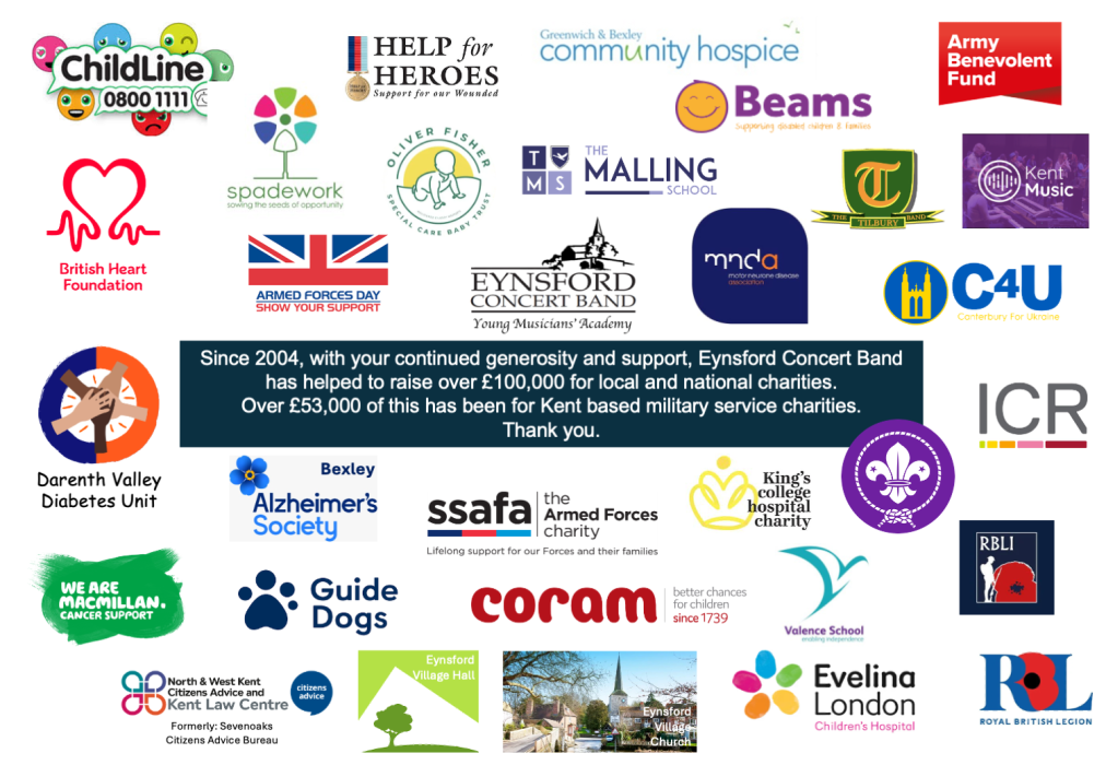Each year we work with a charity that means something to a member of the band. We then contribute profits from concerts, activities and social events to support them. We’ve worked with a wide range of organisations, including Childline, British Heart Foundation, Darenth Valley Hospital, Macmillan Cancer Support, Guide Dogs for the Blind, Spadework, Army Benevolent Fund, Oliver Fisher Special Care Baby Trust, Bexley Alzheimers Society, Coram Children’s Charity, Help for Heroes, Greenwich and Bexley Hospice, Kings College Hospital CCU, Evelina Childrens Hospital, Valence School, Motor Neurone Disease Association, Barnados, Canterbury for Ukraine and others. Over £53,000 of the funds raised has been for Kent based military service charities.